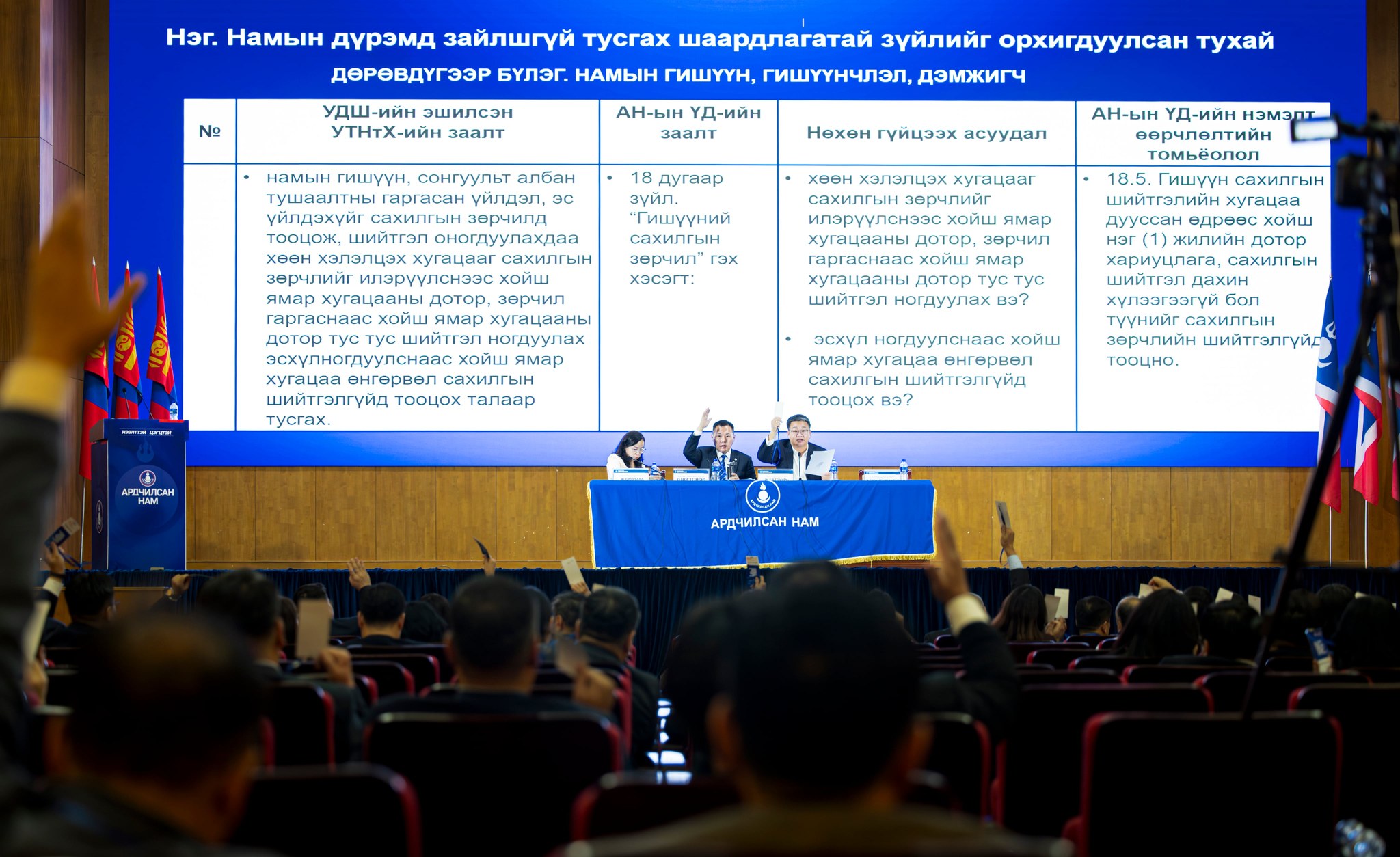 Ардчилсан намын Ерөнхий нарийн бичгийн дарга Н.Ганибал: Улсын дээд шүүхээс ирүүлсэн тогтоолд дурдагдсан бүх шаардлагыг хангаж, ҮБХ-ны ээлжит 67 дугаар хуралдаанаар Үндсэн дүрмийн нэмэлт өөрчлөлтийг баталлаа