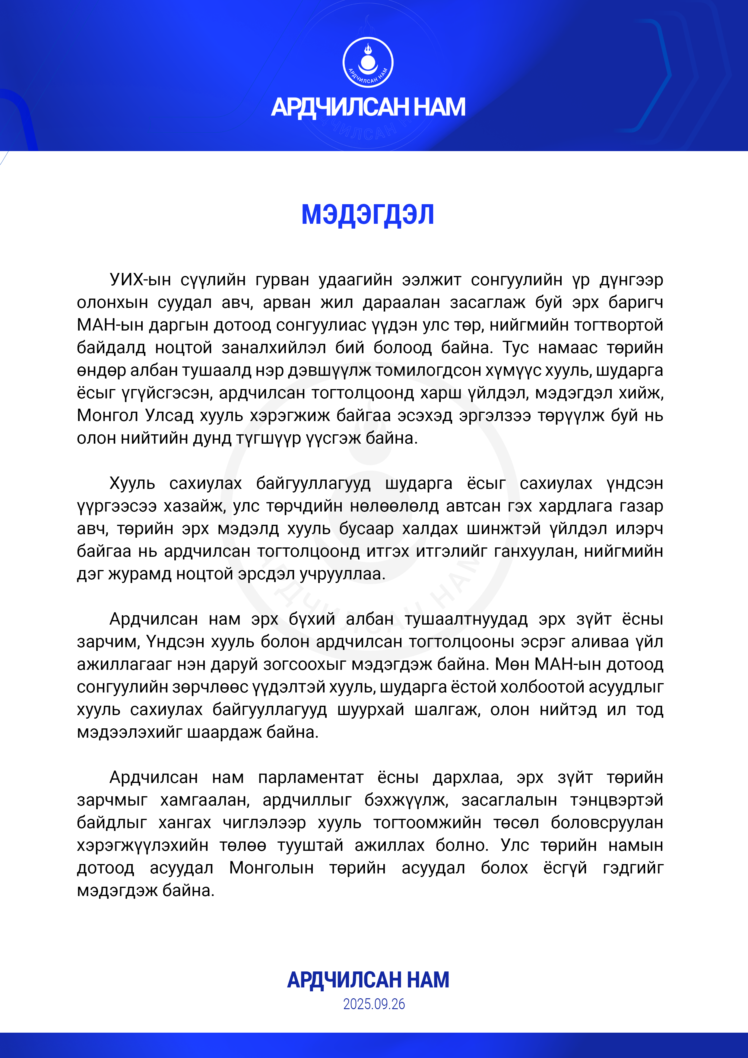 Улс төрийн намын тухай хуульд нийцүүлсэн боловсруулсан Үндсэн дүрэм, намын хөтөлбөрийн шинэчилсэн төсөл батлагдлаа